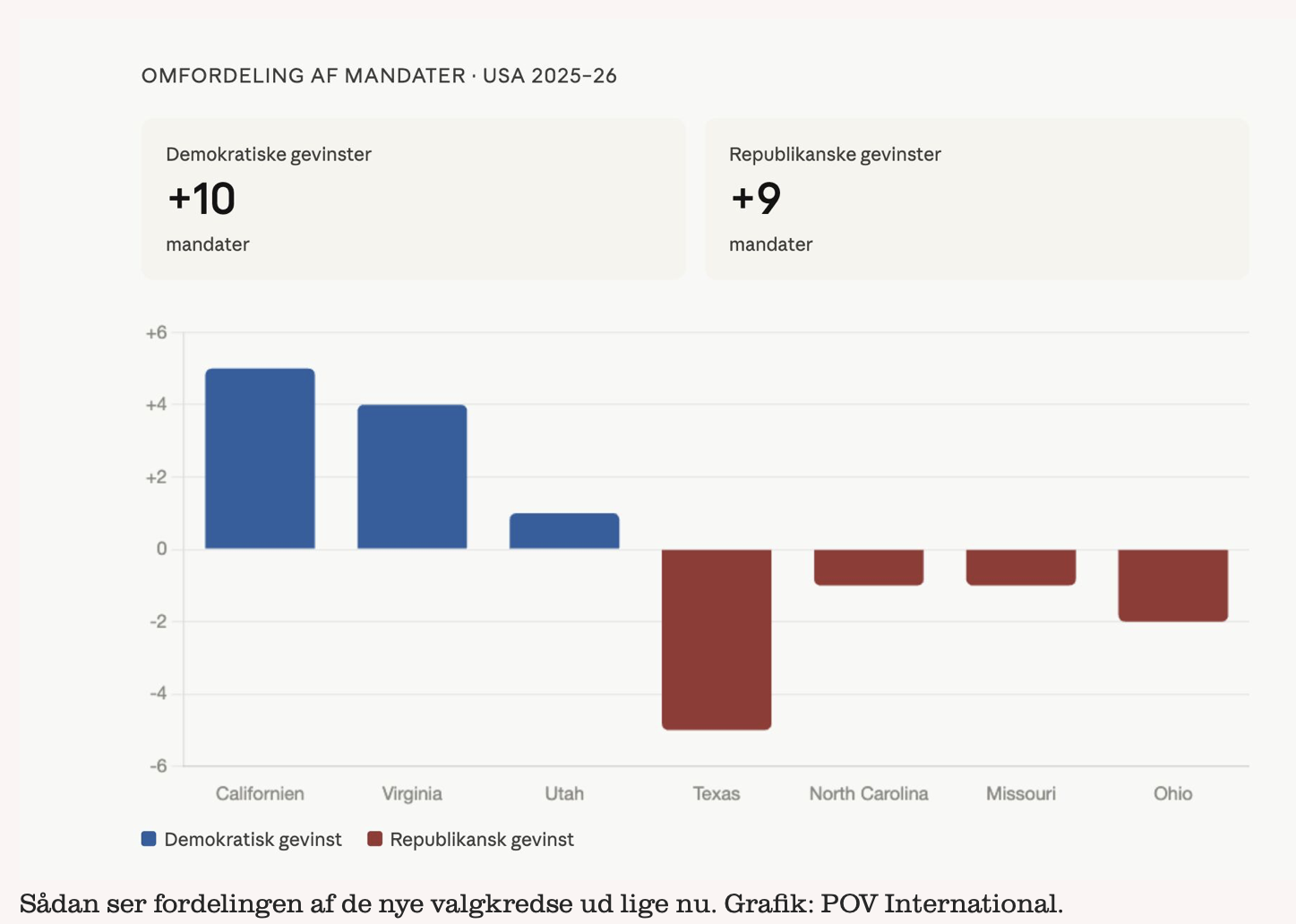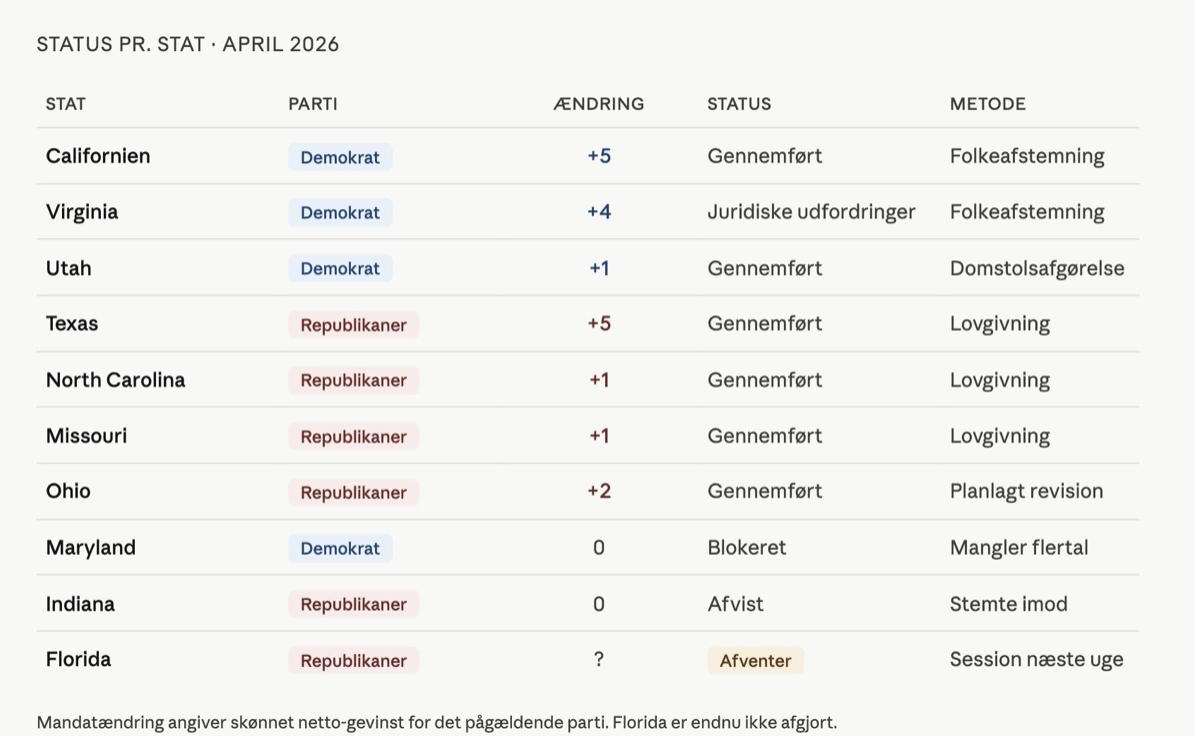Det foreløbige samlede regnskab ser sådan ud: North Carolina og Missouri har hver omfordelt ét mandat i republikansk retning. Ohio har ved en allerede planlagt ændring skabt to nye kredse med en svag republikansk fordel. Tilsammen kunne disse ændringer give republikanerne ni ekstra mandater. Men med Virginias beslutning har demokraterne nu samlet vundet terræn svarende til ti mandater: fem i Californien, fire i Virginia og én domstolsbestemt ændring i Utah.